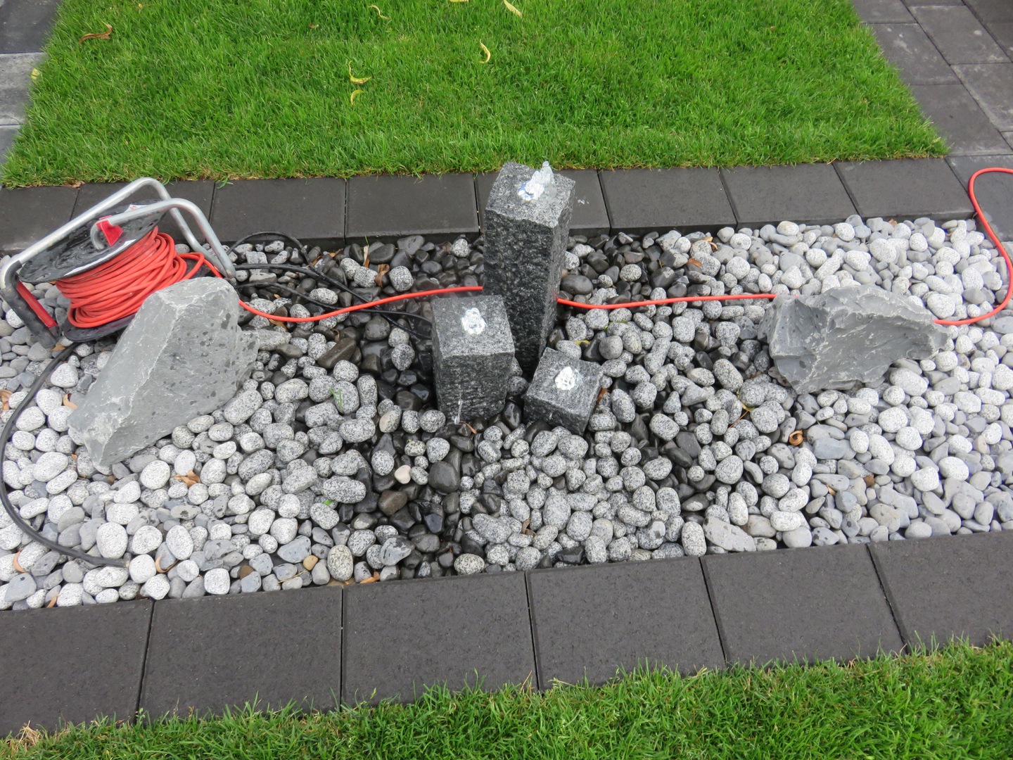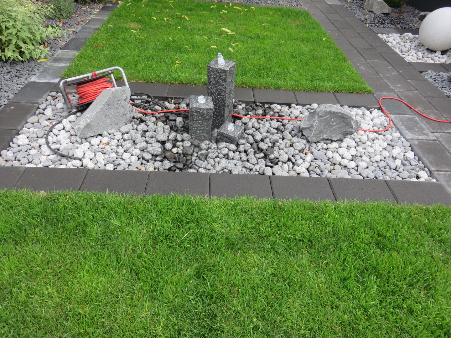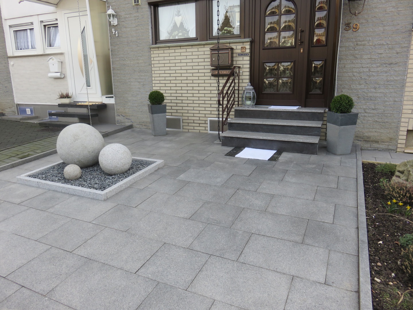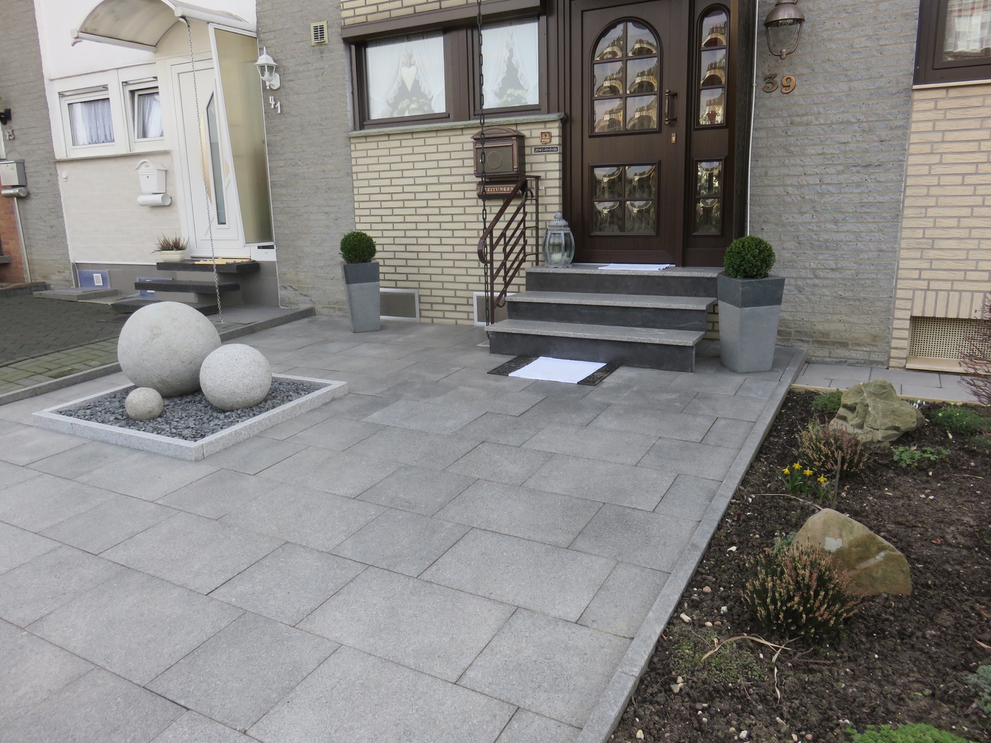 Deko im Vorgarten (Granitkugeln und Granitblumenkübel mit Bepflanzung)